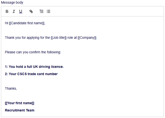 Insert auto populate fields where you want to personalise the message, for example at the greeting or in the job details.